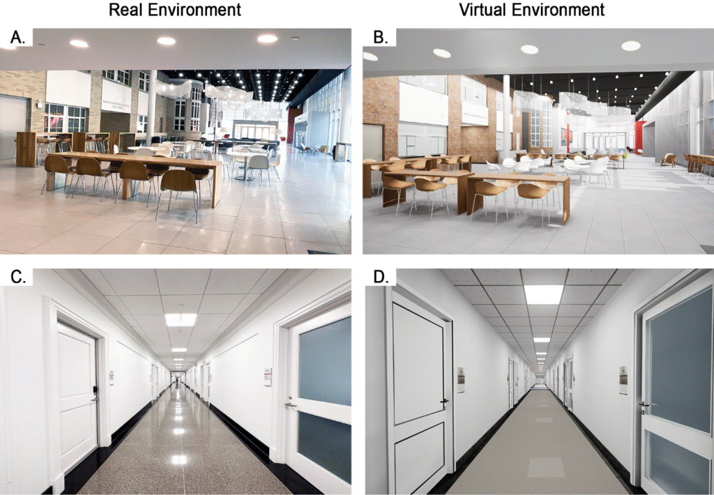 Virtual environments (VEs) are increasingly being used as a research platform for investigating human responses to environmental variables. While VEs provide tremendous advantages in terms of variable isolation and manipulation, and ease of data-collection, some researchers have expressed concerns about the ecological validity of VE-based findings; that is, their transferability to real-world contexts. In the current study we created a virtual replica of a real-world, multi-level educational facility, and compared data collected in the VE vs. the real-world environment as participants completed identical navigational tasks. We found significant differences in all of the measures used, including distance covered, number of mistakes made, time for task completion, spatial memory, extent of backtracking, observation of directional signs, perceived uncertainty levels, perceived cognitive workload, and perceived task difficulty. We also analyzed potential age-related effects to look for heightened VE/real-world response discrepancies among older adult participants (age 55 or over) compared to younger adults (18–30 years of age). This analysis yielded no significant age-by-condition interaction effects. Finally, we examined the spatial distribution of self-reported wayfinding uncertainty across the building floorplan, finding that areas in which uncertainty was most pronounced were similar between the real-world and VE settings. Overall, these findings indicate that while virtual reality can be a useful design research tool, caution is needed when interpreting and generalizing its results