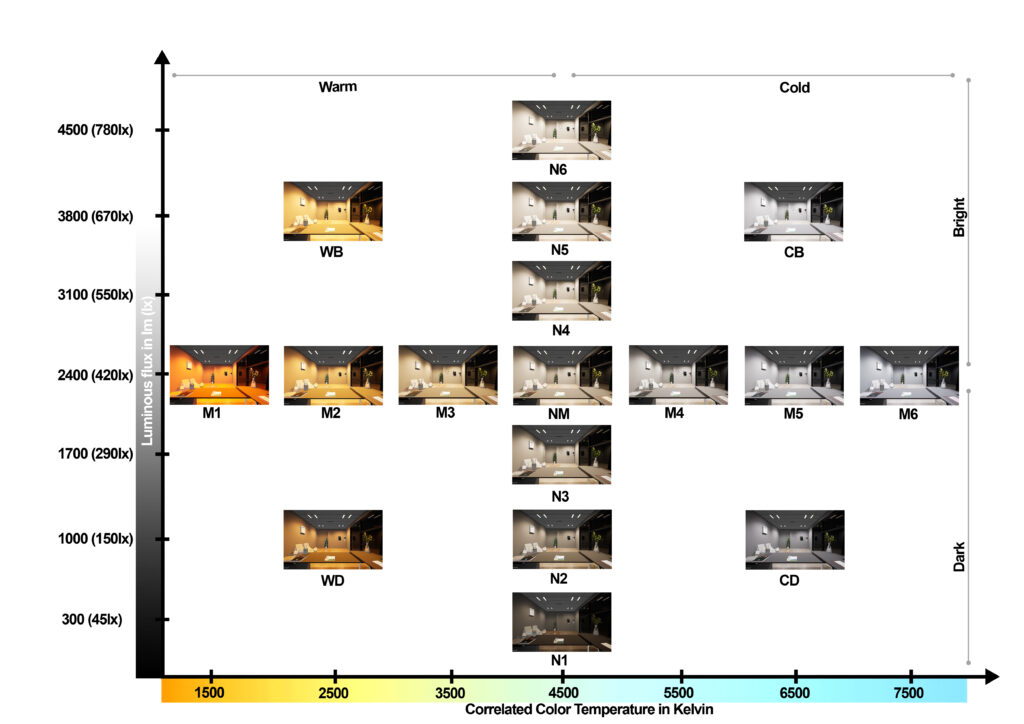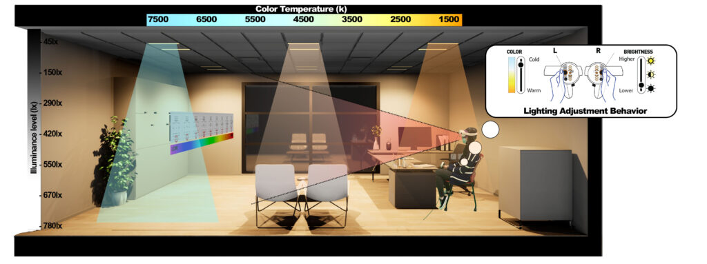 This article presents a novel approach to assessing human reactions to indoor artificial lighting and lighting adjustment behavior. Participants (n = 27) were each exposed to 17 different lighting conditions via selected combinations of seven illuminance levels and seven different correlated color temperatures (CCTs) in a virtual office environment. We collected data about emotional valence, arousal, adjusted values, and adjustment uncertainty (via the number of button presses) in each lighting condition. We also considered potential gender effects in the responses to the lighting. The study confirmed the presence of “anchor effects,” in which starting conditions significantly impacted subsequent preferences and adjustment behavior. After multiple randomized trials, we also found that lighting preferences shifted toward reduced illuminance. Moreover, women were found to have a lower preference for illumination levels and correlated color temperature than men. A greater Adjustment Uncertainty for illumination was associated with lower illumination values (<290 lx), while this was peaking at mid-range levels for CCT (3500 K–5500 K). The variety of behavioral response profiles we found in lighting adjustment, along with the likely impact of gender and other demographic variables, highlights the importance of customization options in lighting design for higher indoor environmental quality. This research supports architects and engineers in creating lighting designs attuned to occupants’ emotions, preferences, and adjustment behaviors while emphasizing the benefits of using VR simulations in the AEC industry to assess lighting design impacts on users.
