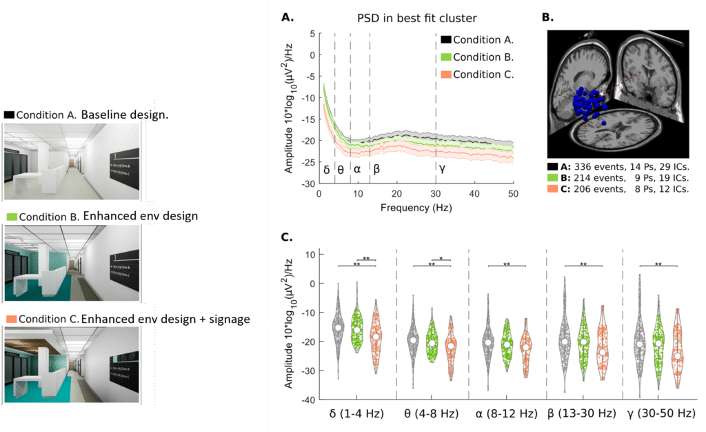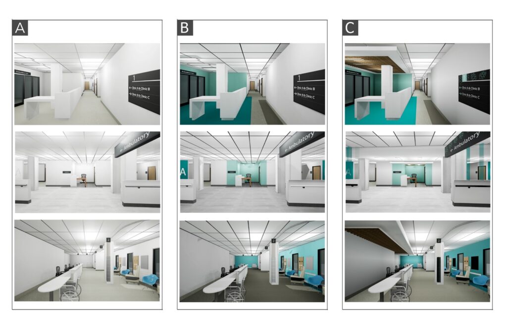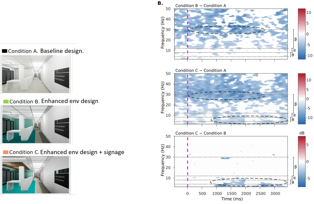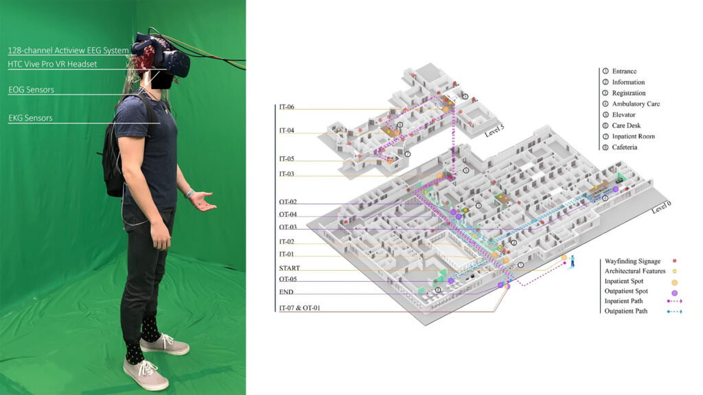 Wayfinding difficulties in healthcare facilities have been shown to increase anxiety among patients and visitors, to reduce staff operational efficiency, and to increase operational costs. There is evidence that wayfinding-oriented interior design features can mitigate these problems, but the robust evaluation of wayfinding design strategies is hindered by the unique nature of each building and the expense of testing different navigational aids. The current study implemented a novel testing approach using virtual reality and EEG data to evaluate the effects of three different interior designs, using altered color patterns, graphics, and architectural features intended to enhance wayfinding in a specific hospital facility. Multiple sources of data including self-reported responses, behavioral metrics, and measurements of neural activity in wayfinding-relevant brain regions were collected. The results indicated that the most extensive wayfinding design was associated with improvements in some orientation behaviors and with greater neurological activation in the brain regions of interest. However, these findings did not translate into improved wayfinding times or reductions in self-reported stress, fatigue, or confusion. The authors discuss the implications of these findings and make extensive recommendations for the future directions of evidence-based pre-construction design testing. The streamlined testing platform and data-analysis approach that was developed in this work can make this evidence-based approach more feasible for other researchers and professional designers, eventually leading to a broad comparative data-set incorporating a wide range of buildings and participants.