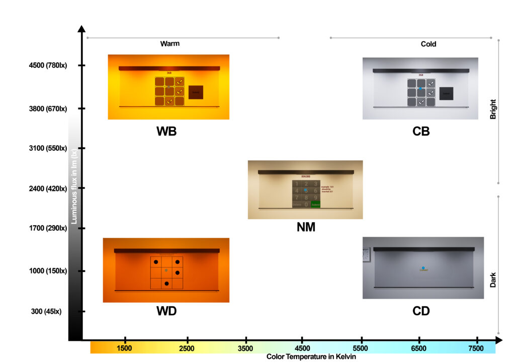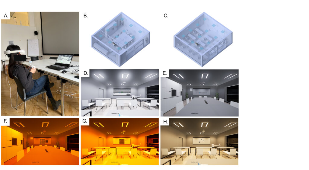 This study contributes to the ongoing exploration of methods to enhance the environmental design, cognitive function, and overall wellbeing, primarily focusing on understanding the modulation of human cognitive performance by artificial lighting conditions. In this investigation, participants (N=35) engaged with two distinct architectural contexts, each featuring five different lighting conditions within a virtual environment during specific daytime scenarios. Responding to a series of cognitive memory tests, we measured participant test scores and the corresponding reaction time. The study’s findings, particularly in Backward Digit Span Tasks (BDST) and Visual Memory Tasks (VMT), indicate that diverse lighting conditions significantly impacted cognitive performance at different times of the day. Notably, the BDST scores were mainly affected by lighting conditions in the afternoon session, whereas the VMT scores were primarily influenced in the morning sessions. This research offers support for architects and engineers as they develop lighting designs that are sensitive to the cognitive performance of occupants. It highlights the advantages of utilizing VR simulations in the AEC industry to assess the impact of lighting designs on users. Further research can lead to the development of lighting systems that can promote better cognitive function and overall wellbeing.